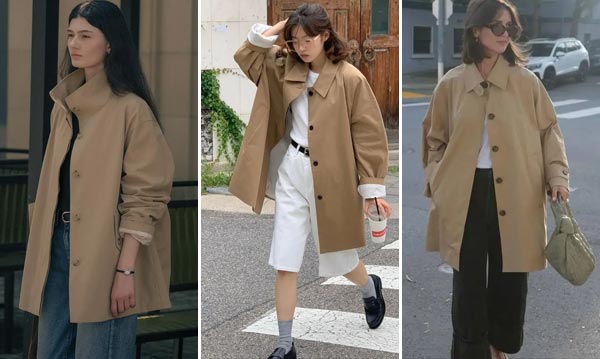 The scarf-style trench coat is also a popular trend this year. The overlapping pattern at the neck creates a unique layered effect. Even if the long trench coat obscures the details underneath, it still highlights the coat's silhouette.
