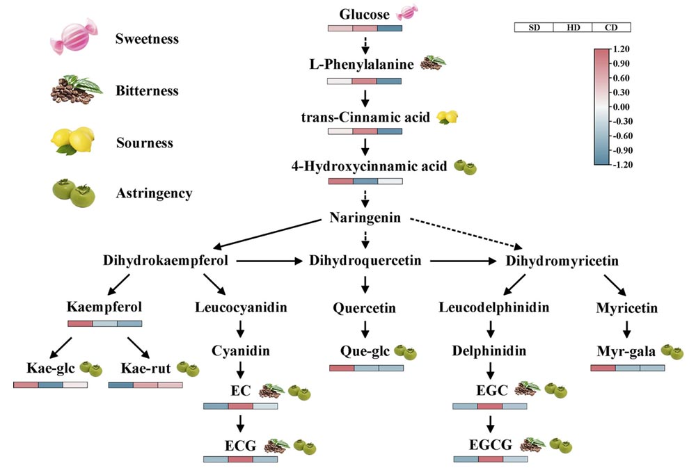 Kaempferol-3-Glucoside (Kae-glc), Quercetin-3-Glucoside (Que-glc), and Myricetin-3-Galactoside (Myr-gala). These molecules can indirectly reduce bitterness and astringency.