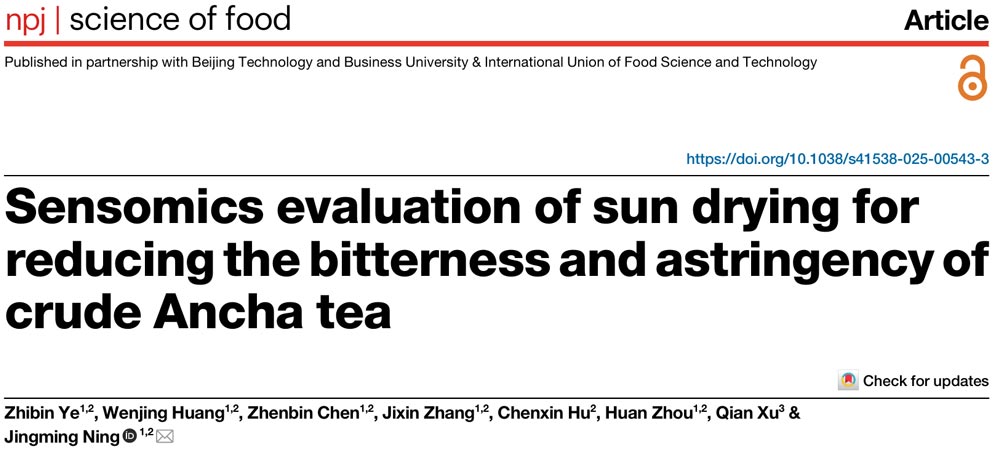 Recently, a team from Anhui Agricultural University published a paper titled "Sensomics Evaluation of Sun Drying for Reducing the Bitterness and Astringency of Crude Ancha Tea" in npj Science of Food, revealing the scientific wisdom behind reducing the bitterness and astringency of Ancha tea.
