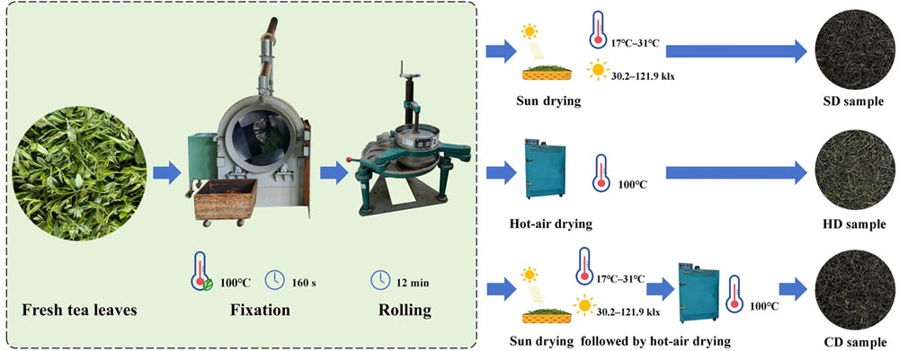 - Hot Air Drying (HD): This method, aimed at efficiency, uses direct 100°C hot air drying for 40 minutes to quickly dry the tea.