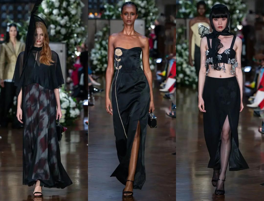 Black organza and ombré roses covered the stage, while vintage coats and wedding dresses intertwined memories of the past.