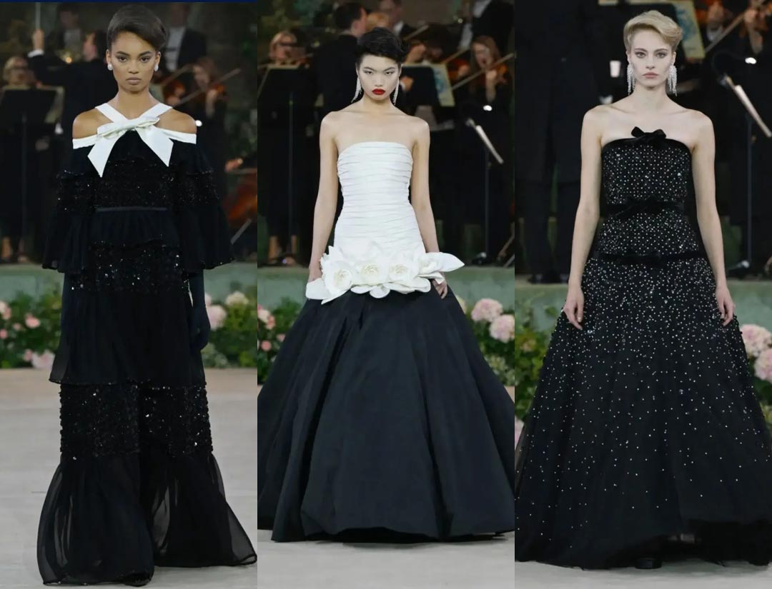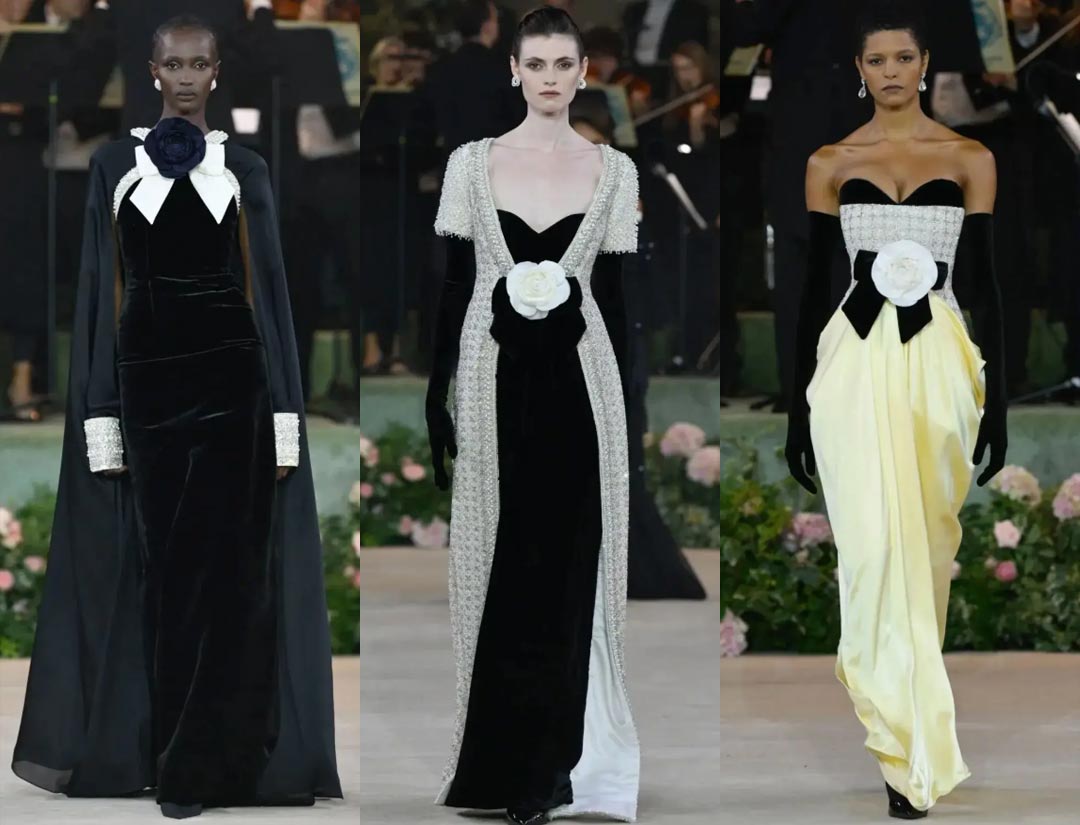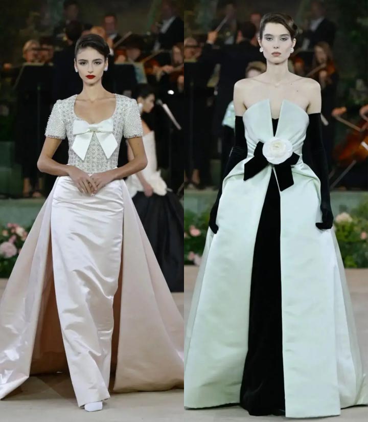 Meanwhile, leather and lacquer materials made a striking appearance, shattering the romantic atmosphere. Colors danced between creamy white and scarlet, creating a sharp undercurrent within the romance.