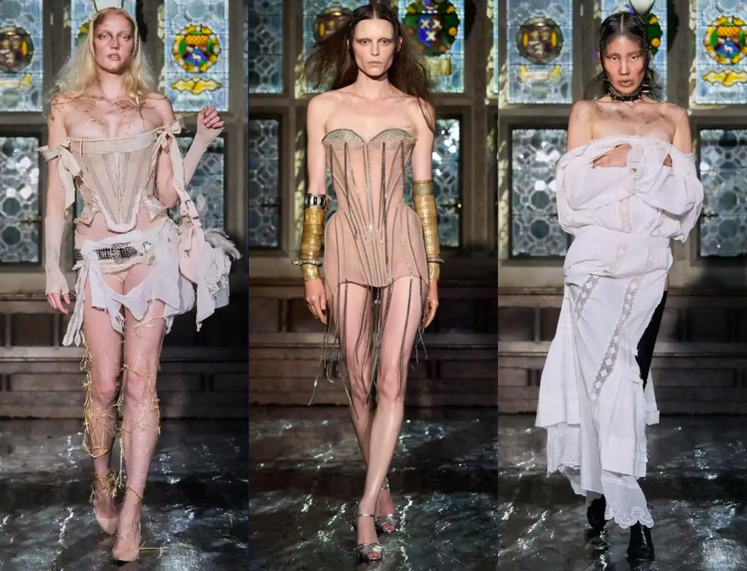 The stage, shrouded in darkness, created a sense of oppression, with corsets, shredded lace, and tulle layered together, while cherries and metal chains added a touch of danger.