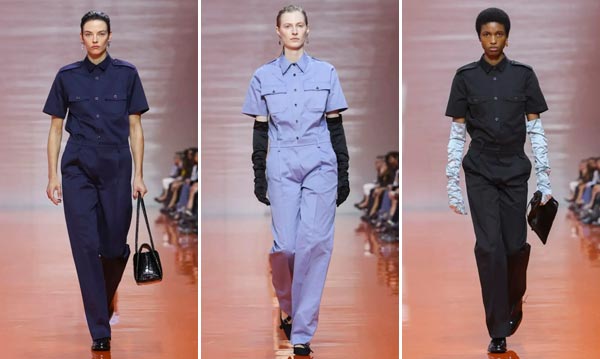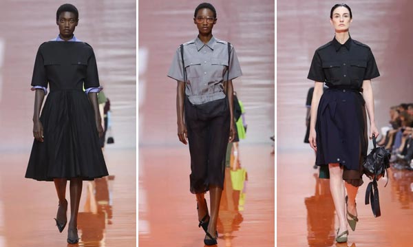 Uniforms can be worn on equal terms with evening gowns, work coats dance alongside lace skirts. Prada uses seemingly contradictory elements to reconstruct a new kind of elegance.