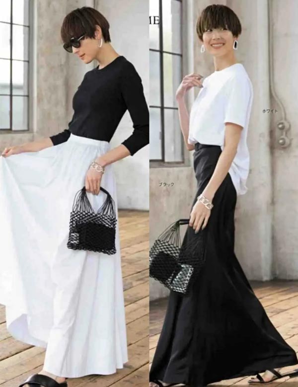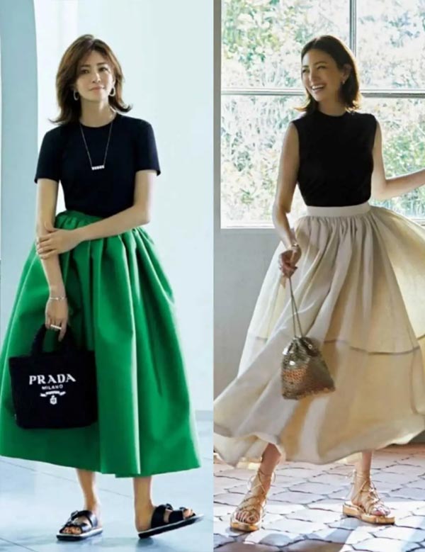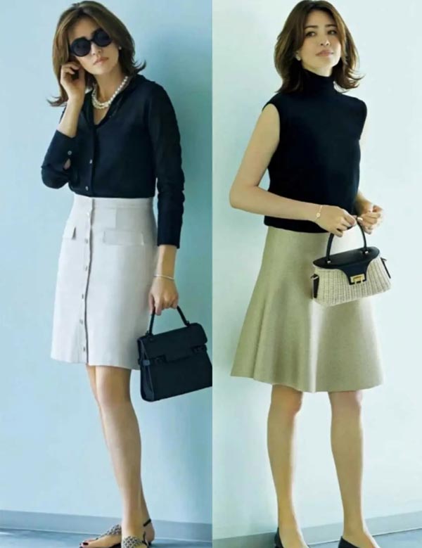 A simple black shirt or sleeveless style paired with a high-waisted skirt can create a feminine and elegant look.
