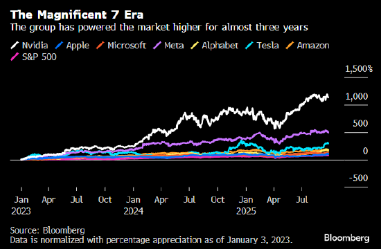 It's been nearly three years since OpenAI's ChatGPT propelled artificial intelligence to the center stage of the global economy, fueling a single trading theme dominating the US stock market: buy the tech Mag Seven. Nvidia, Microsoft, Apple, Alphabet, Amazon, Meta Platforms, and Tesla—these seven stocks are seen as the best bets to deliver outsized returns to investors during the biggest technological shift since the internet era.