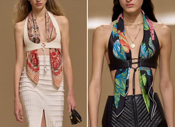 A silk scarf is casually folded into a top, cinched by a leather corset, or transformed into a sculptural neckpiece, interwoven with a necklace. These ingenious layering techniques aim to highlight, rather than obscure, the figure.
