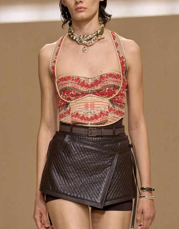 A bodice supports the fluid, draped silhouette, embellished with the vibrant pattern of the Aux champs en fleurs scarf. A form-fitting quilted dress, inspired by a corset, features a belt and cords, paired with cycling shorts, embodying traditional craftsmanship with a sporty spirit.