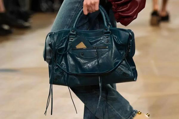 A Balenciaga signature, the Le City motorcycle bag remains a key focus for Pierpaolo Piccioli this season, with the bags' colors primarily matching the hues of the outfits.