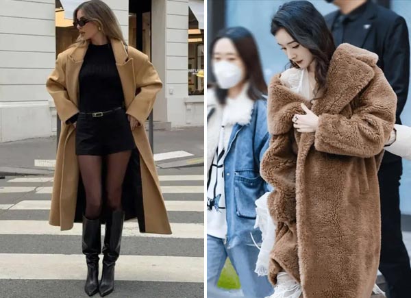 Brown coats are common in winter. Pairing them with a black skirt or shorts creates an elegant, romantic, and feminine look.