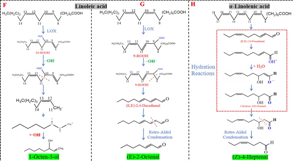 - (Z)-4-heptenal, produced from the oxidation of α-linolenic acid, imparts a fresh, green, leafy aroma. While its concentration is low at 12 hours, it can partially neutralize the burnt aroma, resulting in a softer mouthfeel.