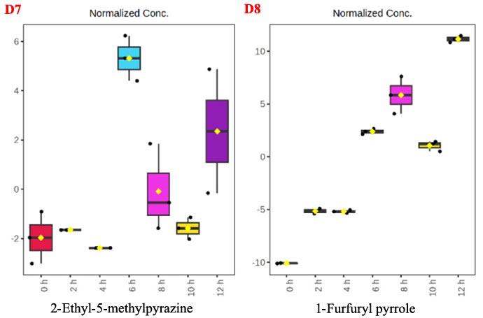 Changes in the Content of 2-Ethyl-5-methylpyrazine and 1-Furfuryl pyrrole