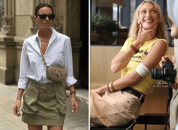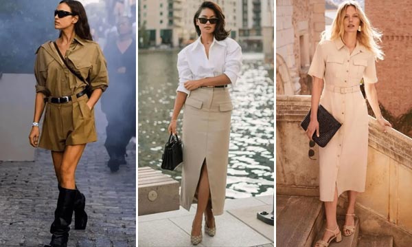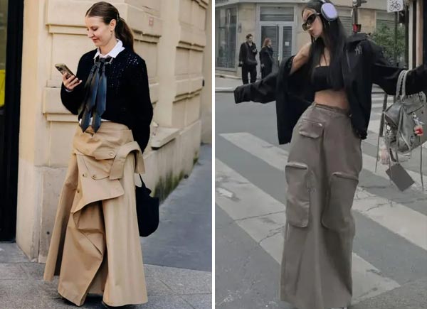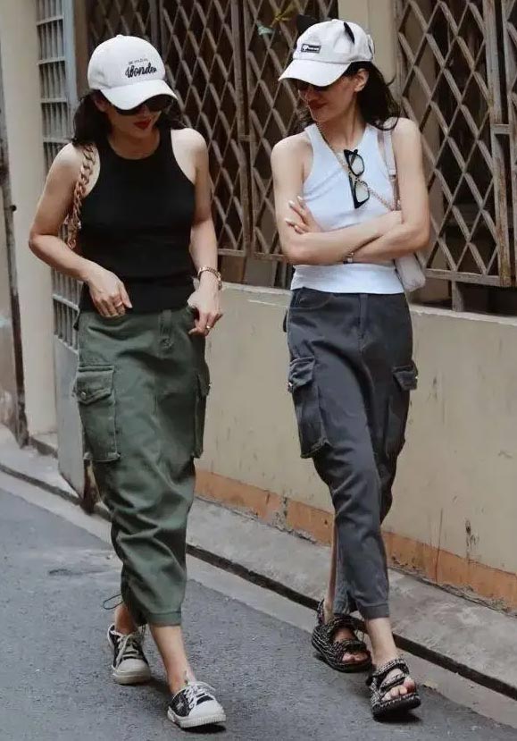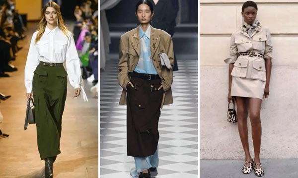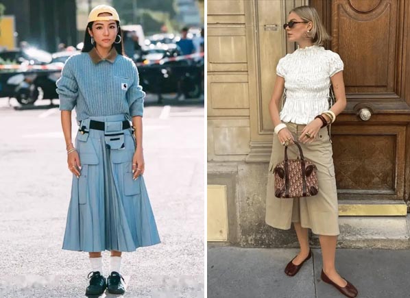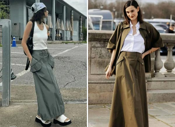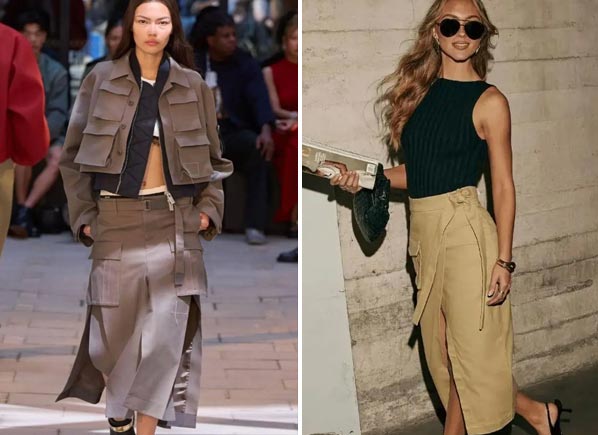 Continuing this military retro aesthetic, this skirt offers a calming yet captivating look. Paired with a matching top, it effortlessly creates an urban, outdoor vibe. As seen at the Sacai 2025 runway, military green work skirts have become a classic choice for high-end outfits.