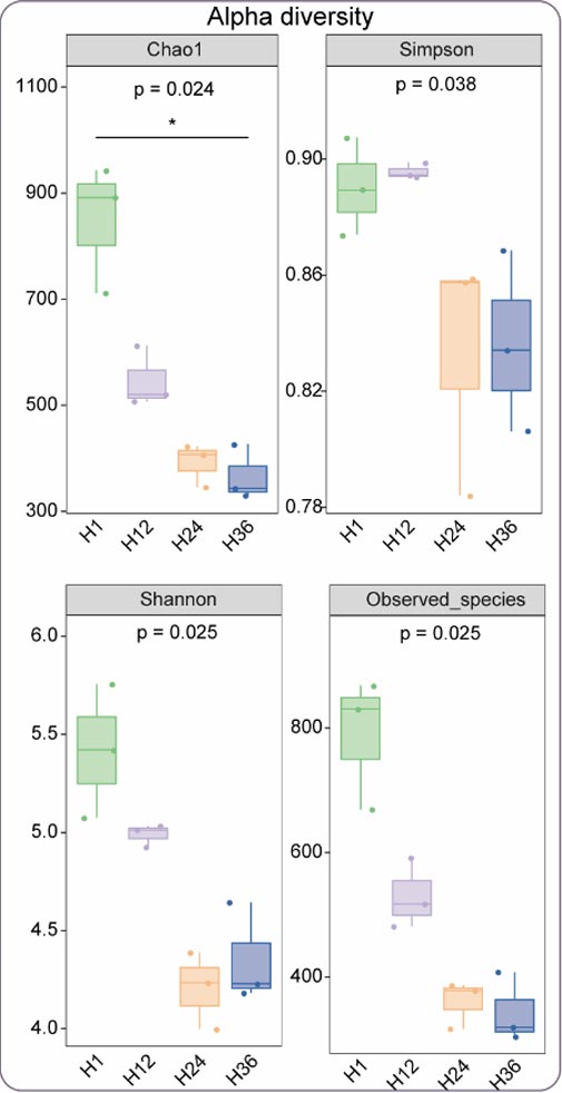 As time progressed, the number of microbial species decreased, until, at 36 hours, only a few dominant bacteria remained, with Bacillus species being the most prominent.
