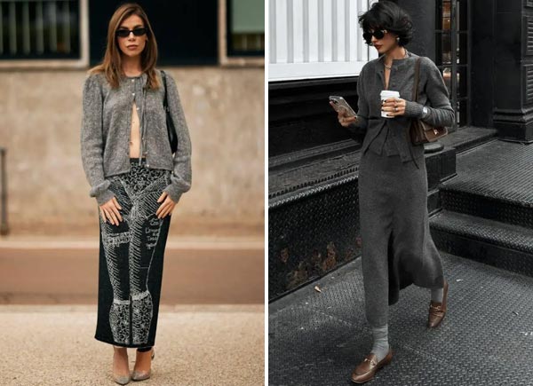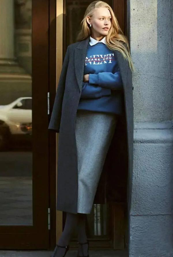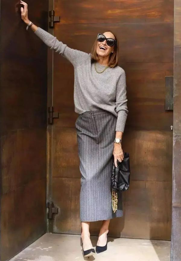 Gray sweater + straight skirt: Slightly tuck in the front to highlight the waistline and effortlessly create a good proportion.