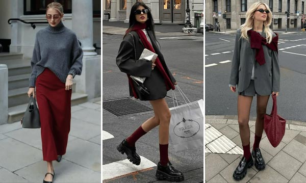 Gray is a calming background color, but adding a small pop of bright color instantly livens up the look: Gray + Anchor Red, with a bag or scarf as a subtle accent, breaks the silence, creating a vibrant yet not overly flashy look.
