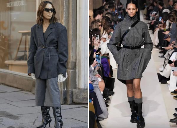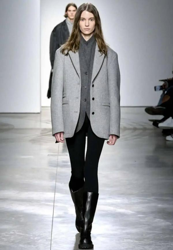 Wide on top, tight on bottom: A gray oversized jacket with skinny black pants and below-the-knee boots creates a subtle yet striking look.