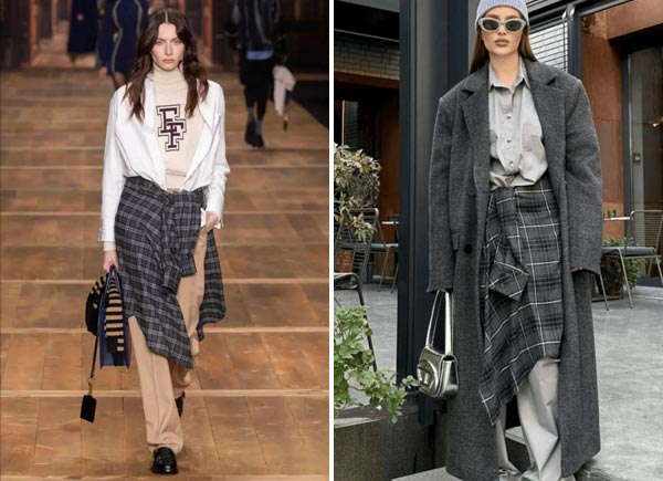 When pairing a shirt/suit with wide-leg pants, tie a gray plaid shirt around your waist for a layered look.