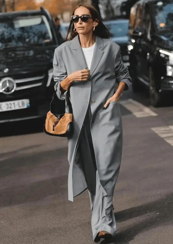 Add a belt: A gray long blazer paired with a long skirt accentuates the waist to emphasize curves;