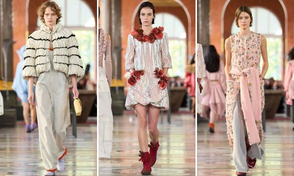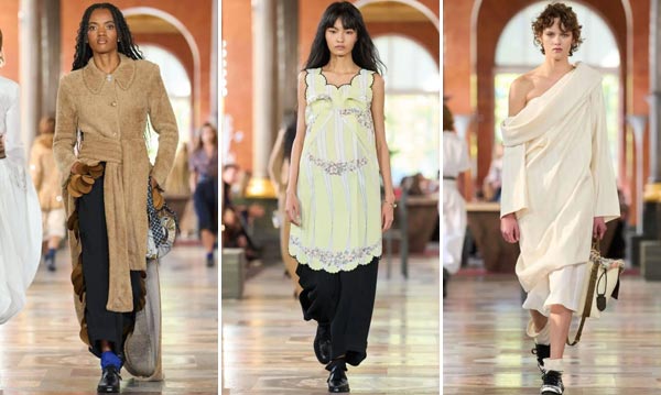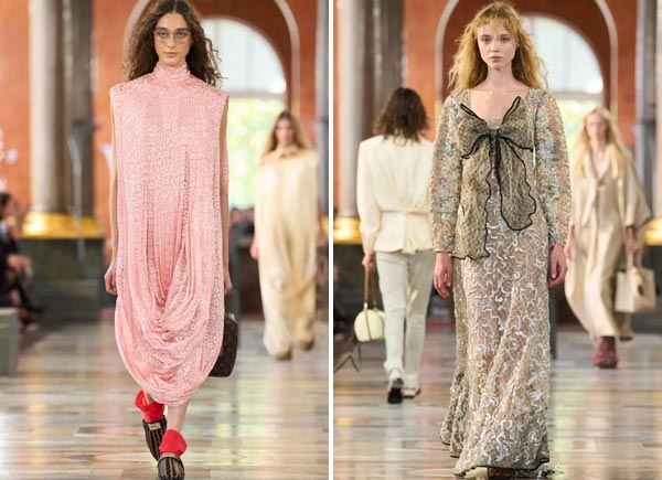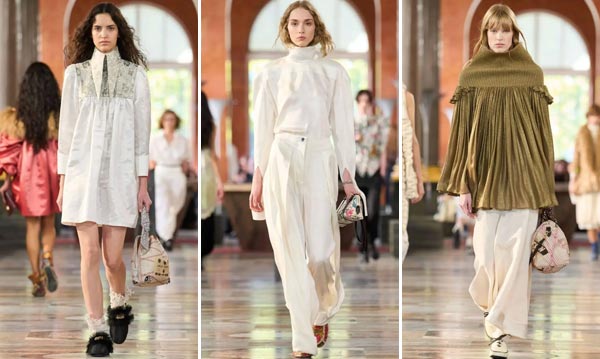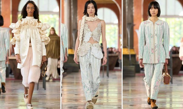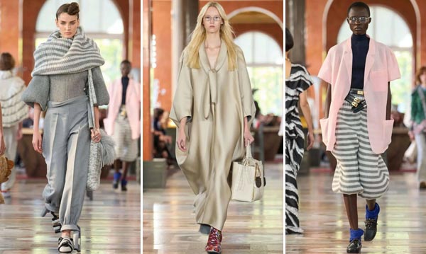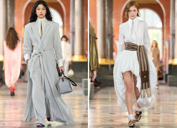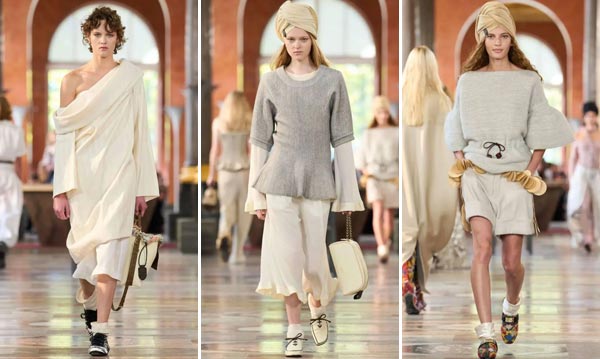 Nicolas Ghesquière has created a chic, home-style wardrobe, showcasing pajama-inspired skirts, loose and comfortable robes, bathrobe-like jackets, soft knits, and loose wide-leg pants.
