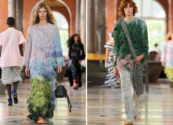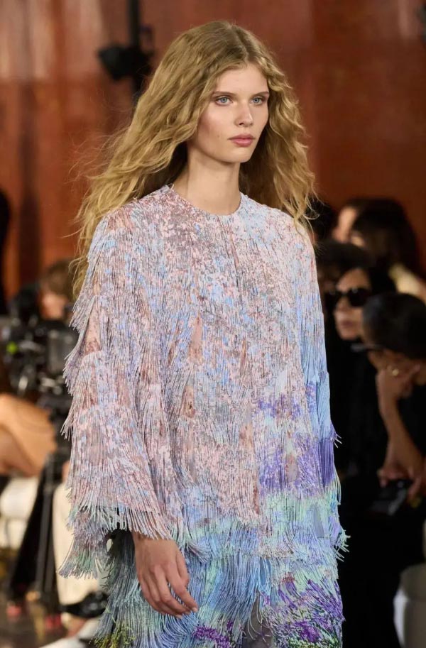 The Louis Vuitton Spring/Summer 2026 collection is, in essence, like the murals on the ceiling of the show, full of Art Deco elements. The gradient colors of the fringed long dresses are like a painting.