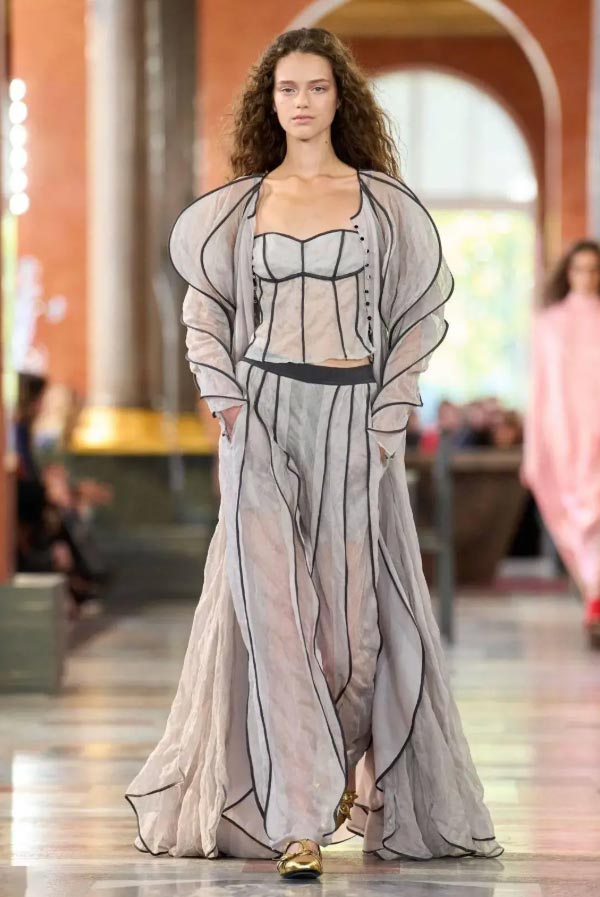 The opening look of Louis Vuitton's Spring/Summer 2026 collection is a light gray silk and linen suit. It features a vintage-inspired corset and a flowing silhouette, while also being lightweight and comfortable for the home, with a touch of sheerness.