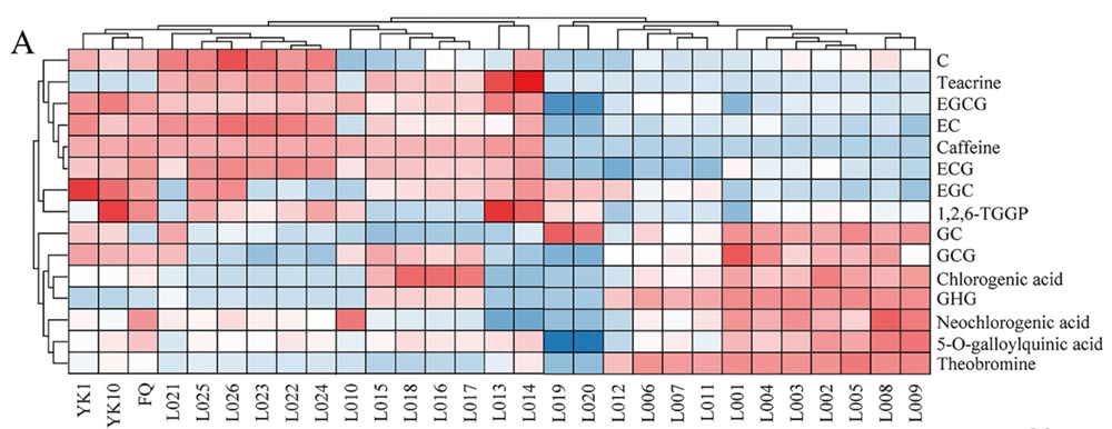 Interestingly, the accumulation patterns of these two compounds are highly consistent. That is, ancient tree teas with high GHG content (such as L001-L005 and L008-L009) also contain high levels of 5-O-galloylquinic acid, and vice versa.