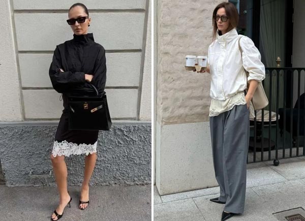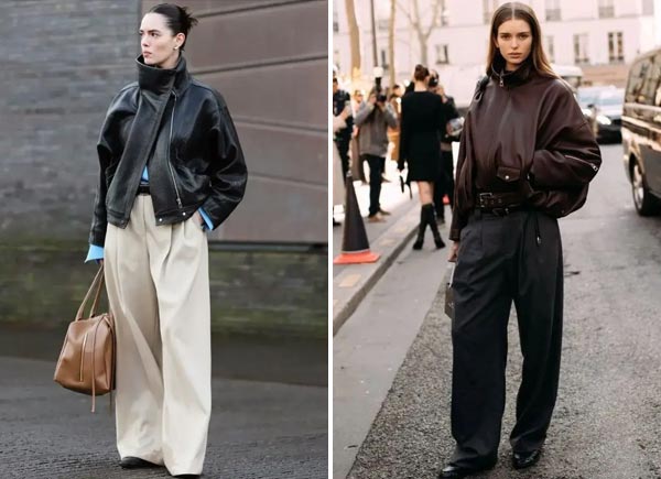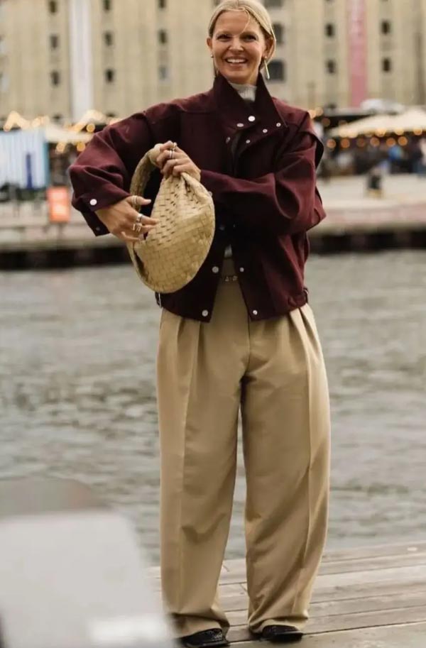 When wearing a jacket, make sure the neckline is the focal point. Pairing it with smooth or draped pieces can offset the stiffness of the jacket and create a more relaxed look.