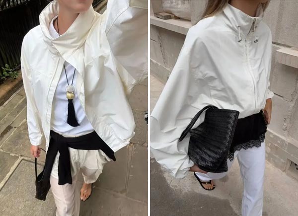 When this familiarity meets the funnel collar, the three-dimensional lines of the collar contrast with the smooth fabric, creating a refreshing and capable look.