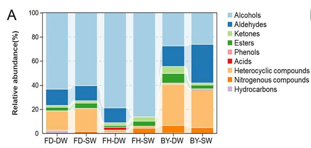 Alcohols and heterocyclic compounds generally possess sweet and fatty aromas, while aldehydes are a key contributor to grassy notes. Dark environments alter the accumulation patterns of these components.