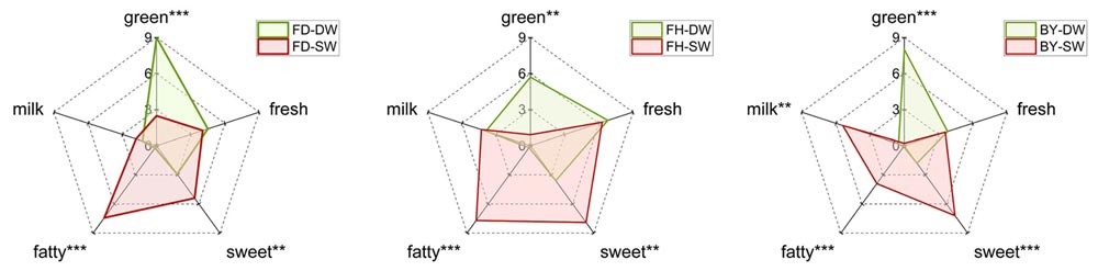 A comparison of the aromas of Fuding Dabai, Fuding Dahao, and Baiye No. 1, grown dark withering (green) and sun withering (red).