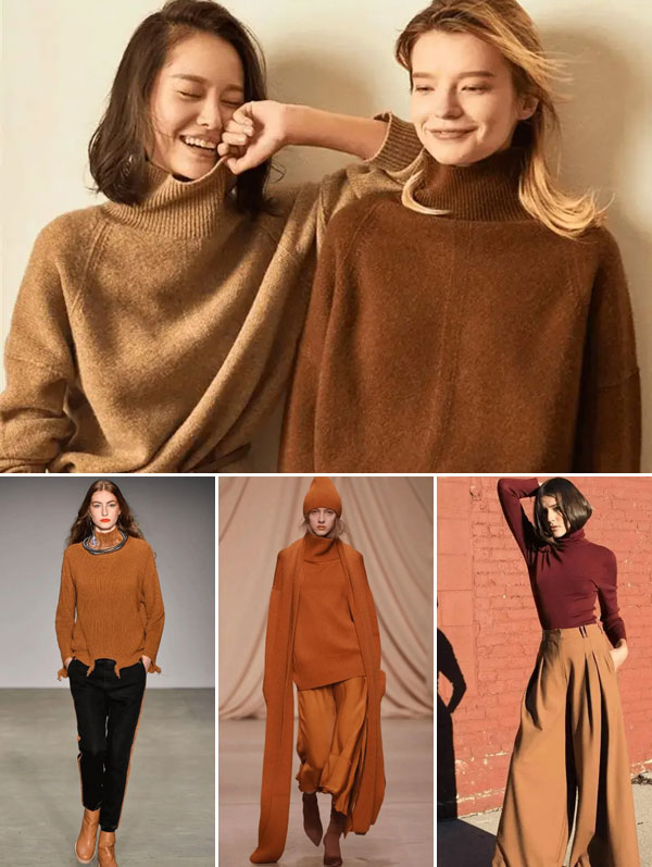 This is a surprising "color-blocking" combination. Especially when paired with denim blue, it effortlessly creates a chic look. A Caramel sweater paired with vintage blue jeans is a timeless classic combination.